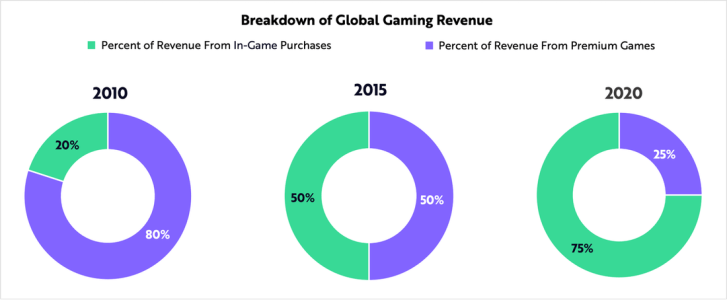 A decade ago, in-game micropurchases made up 20% of gaming revenue. Today, they make up 75%. By 2025, they’ll make up 95%.
