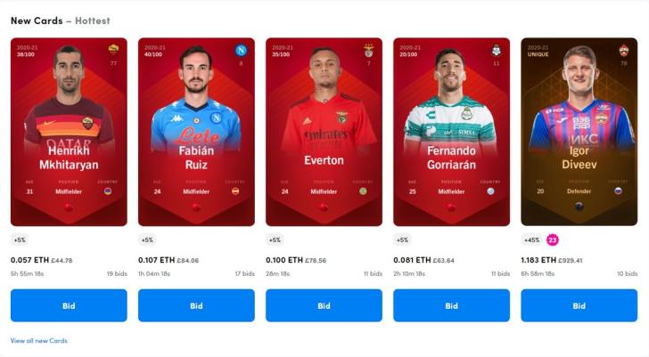 Sorare, a fantasy football game using NFTs, builds on these concepts. Sorare offers tiers of scarcity. In this image, you can see in the upper-left-hand corner of a card how rare it is. The first four cards are each one of 100; they’re priced around £40 to £80. The card on the far right is Unique, meaning it’s the only one of its kind in existence. It’s much more expensive—£929.