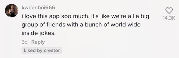 kweenboi666 (quite the handle) is right. The sounds and challenges on TikTok are enormous, collective jokes shared by millions of creators and a billion monthly active users. One week, it’s a cranberry juice-drinking, Fleetwood Mac-listening skateboarder; the next, we’re all debating “it’s giving cher” 💅; last month, we were all on couch guy TikTok. Lying in bed scrolling our FYP, we feel like we belong.