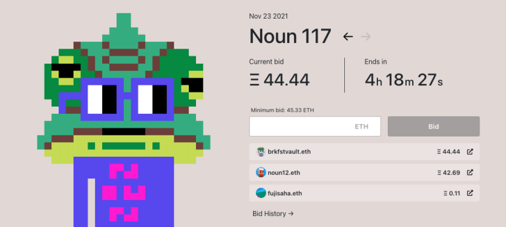 One noun (an avatar) is generated on-chain every day, forever. That noun is trustlessly auctioned every 24 hours, forever, and the settlement of one auction kicks off the next. Auction proceeds flow to the Noun DAO treasury, where 1 noun = 1 vote.