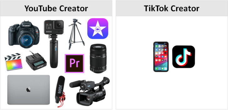 YouTube was revolutionary, but left barriers to creation: (1) the money to invest in expensive tools, and (2) the knowledge of how to use those tools. TikTok removed those barriers with no-code-like tools, leveling the playing field. The result is that 1 in ~1,000 people on YouTube create content, while closer to 60% of TikTok users create.