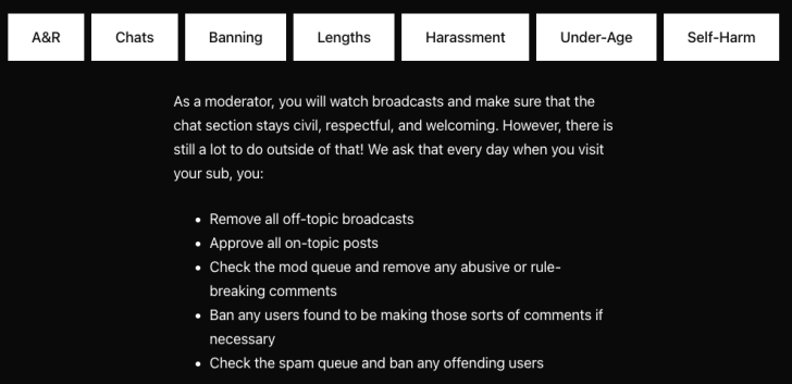 Trial moderators need to read through our moderation guide, attend a training call, and complete a knowledge test before they can start moderating. During their 3-week trial period, they’ll get support from the entire mod team and are encouraged to ask questions and learn as much as they can.