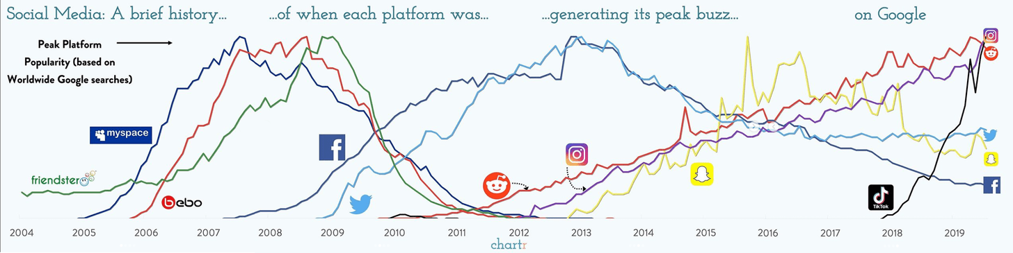 When you chart social platforms over time—some of the largest businesses in history—you see how volatile the history of social is. Platforms come in and out of favor. Consumer behaviors change. Demographics change.