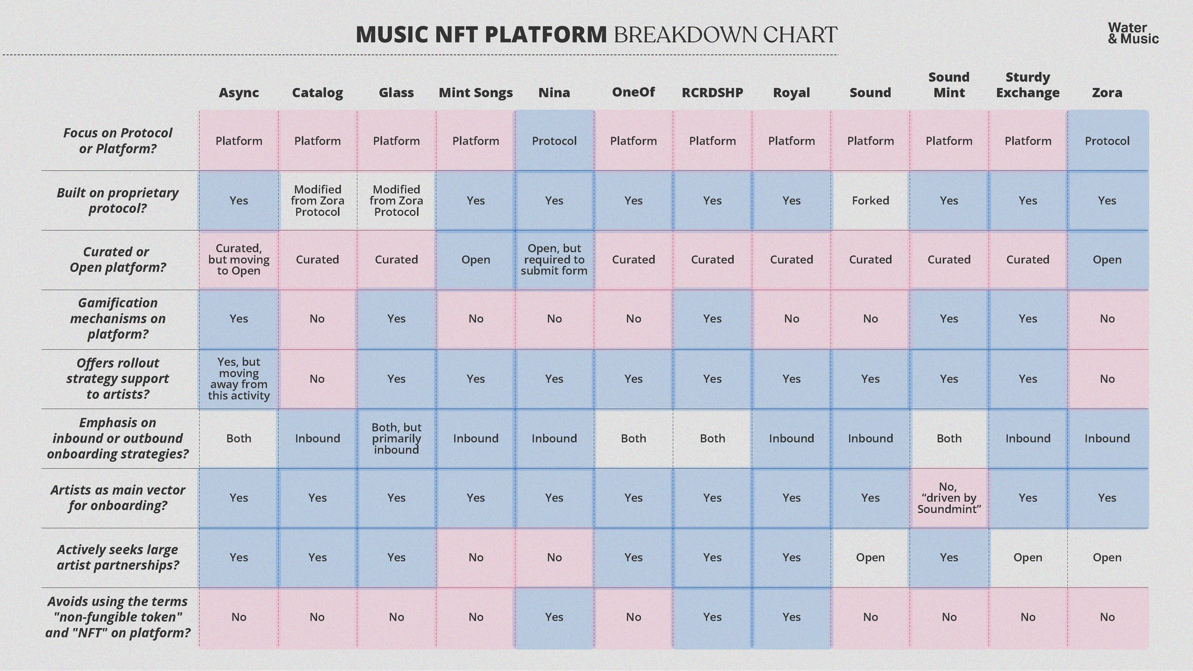 Whether we’ll see the same consolidation to an ecosystem with a small group of companies (Spotify, Apple Music, Amazon Music) dominating the majority of the market is a question for the future. In the meantime, it’s clear that decisions music NFT platforms make around strategies for onboarding will influence whether they can grow into sustainable, long-term players in the market, leading to the continued development of complex relationships among platforms, protocols, artists, fans and collectors.