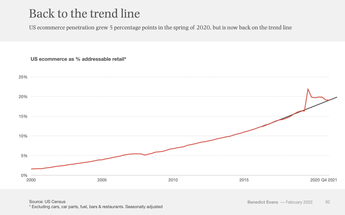 But that chart isn’t the full story. We’ve seen a regression in e-commerce penetration as the world opens up. We’re back on the long-term trend-line: