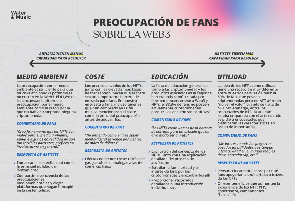 En el capítulo sobre incorporación de fans de nuestro informe colaborativo, presentamos un marco de cuatro partes para entender las principales preocupaciones de fans con respecto a Web3, organizadas en un espectro que va desde las preocupaciones más difíciles de abordar por parte de artistes hasta las que artistes están mejor capacitados para abordar y mitigar en su propio enfoque de incorporación..