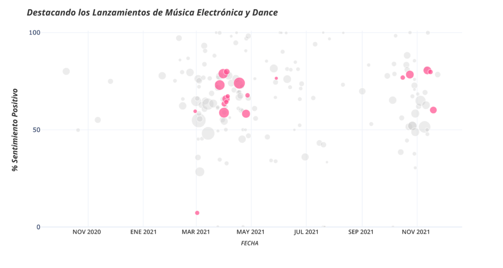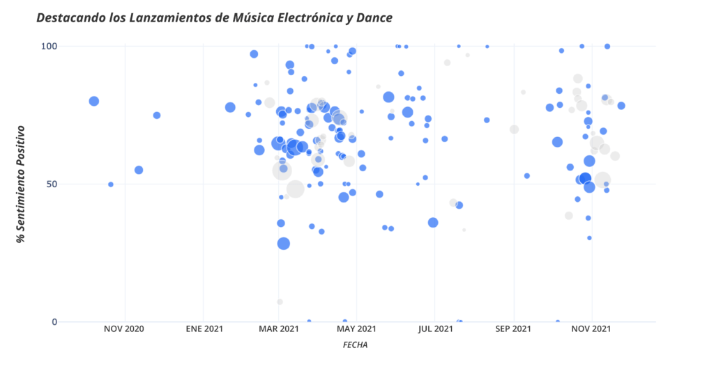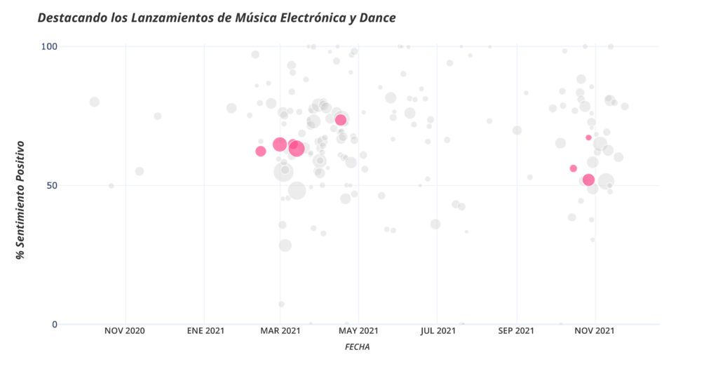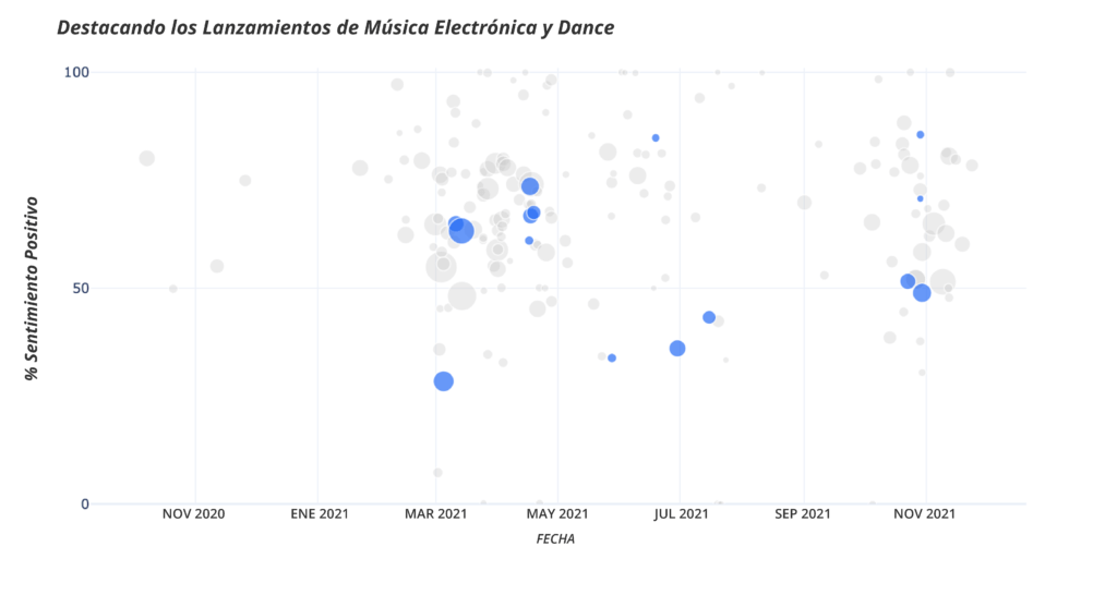 Cada punto en este gráfico representa un lanzamiento de NFT de música. El eje horizontal representa la fecha del anuncio y el eje vertical representa el porcentaje de interacciones que registraron un sentimiento positivo. El tamaño de cada punto ilustra la participación general en Twitter y su color categoriza el género del artiste, modelado a partir de la herramienta de análisis de música: Chartmetric.