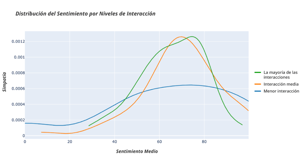 Hemos comprobado que los valores del sentimiento de fans se distribuyen de forma muy similar para los tres niveles de interacción analizados. Es decir, un lanzamiento de NFT con altos niveles de interacción de fans tiene aproximadamente la misma probabilidad de tener una reacción positiva que un lanzamiento con poca interacción. En otras palabras, con nuestros datos en la mano, no podemos afirmar con seguridad que los lanzamientos NFT de artistes más pequeños sean mejor recibidos.
