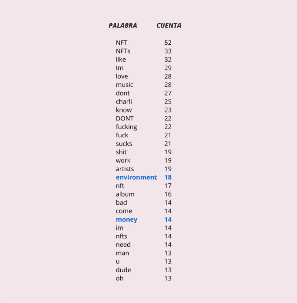 1. Twitter no ha demostrado ser una plataforma efectiva para que artistes aborden las preocupaciones de sus fans sobre los NFTs y aumentar el sentimiento, especialmente en torno a las preocupaciones medioambientales y financieras. Esto puede deberse a que, en general, Twitter no es precisamente la mejor plataforma para debatir con matices temas complejos (quién diría…).