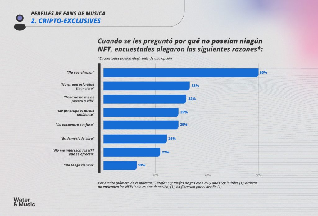 Al observar las respuestas de nuestra encuesta, vemos que más del 60% de fans Cripto-Exclusivamente que se encuestaron, en gran medida “no ven el valor” de los NFTs. Incluso el 12% de quienes tienen propiedad de NFTs que no son de música de nuestra encuesta dicen que no han comprado un NFT de música porque no ven el valor. Algunas citas de muestra: