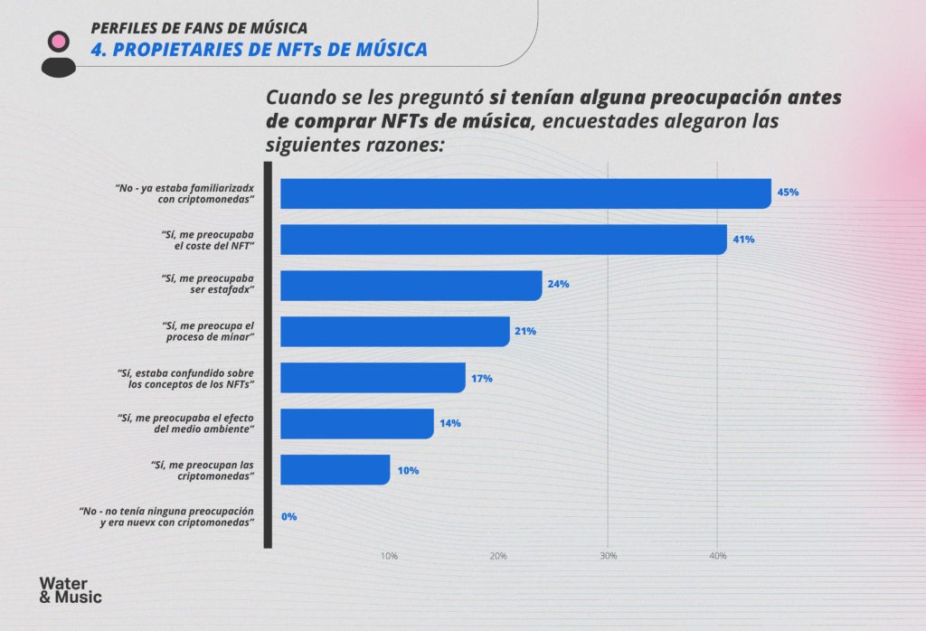 Incluso entre quienes se encuestaron, clasificades como quienes tienen propiedad de NFT de música, el 23% respondió que antes de comprar su NFT de música tuvieron miedo de caer en estafas. A lo largo de nuestra encuesta de fans tuvimos docenas de personas encuestadas que se esforzaron por comunicar sus sentimientos sobre la naturaleza fraudulenta de los NFTs; es decir que eran “esquemas Ponzi”, “caca de perro”, “lavado de dinero” y “para idiotas”.