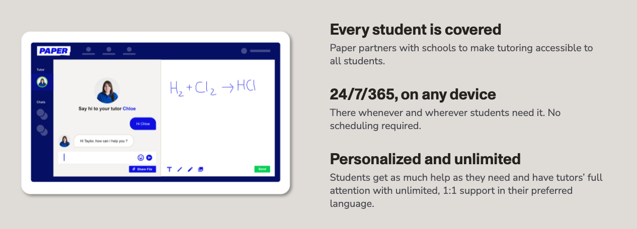 Take Paper, a startup that partners with schools to offer scalable and personalized tutoring to students. Teachers can use Paper to amplify what they’ve taught in class, tracking learning gaps and better allocating instructional time.