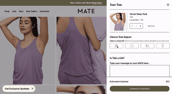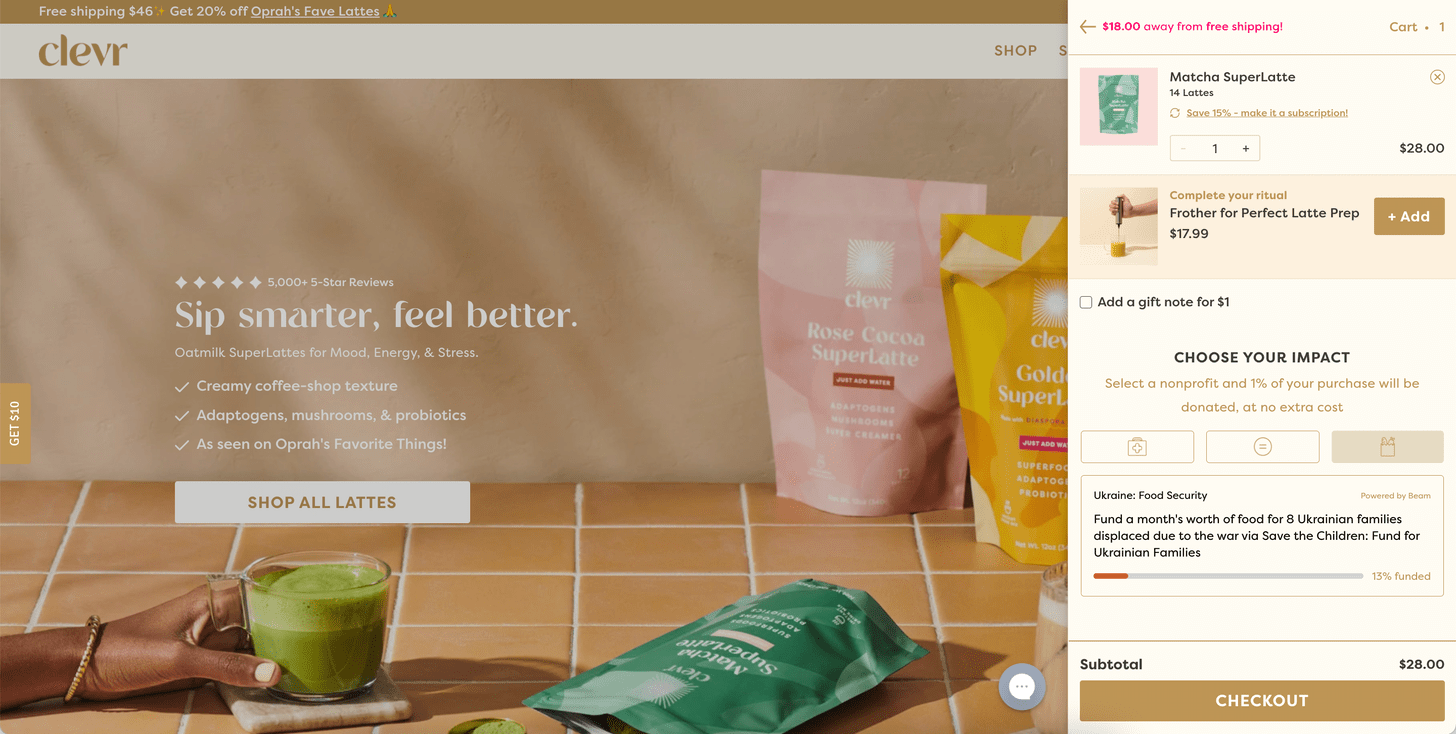 Importantly, it isn’t me that’s paying—it’s the brand. Why are brands willing to give up 1% of revenue? For one, brands are able to put their money where their mouth is when it comes to the causes they champion. Communicating these values creates customer loyalty. But more tangibly, brands see real ROI: average order value (AOV) goes up meaningfully; cart abandonment rates go down; shoppers become more likely to become repeat customers.