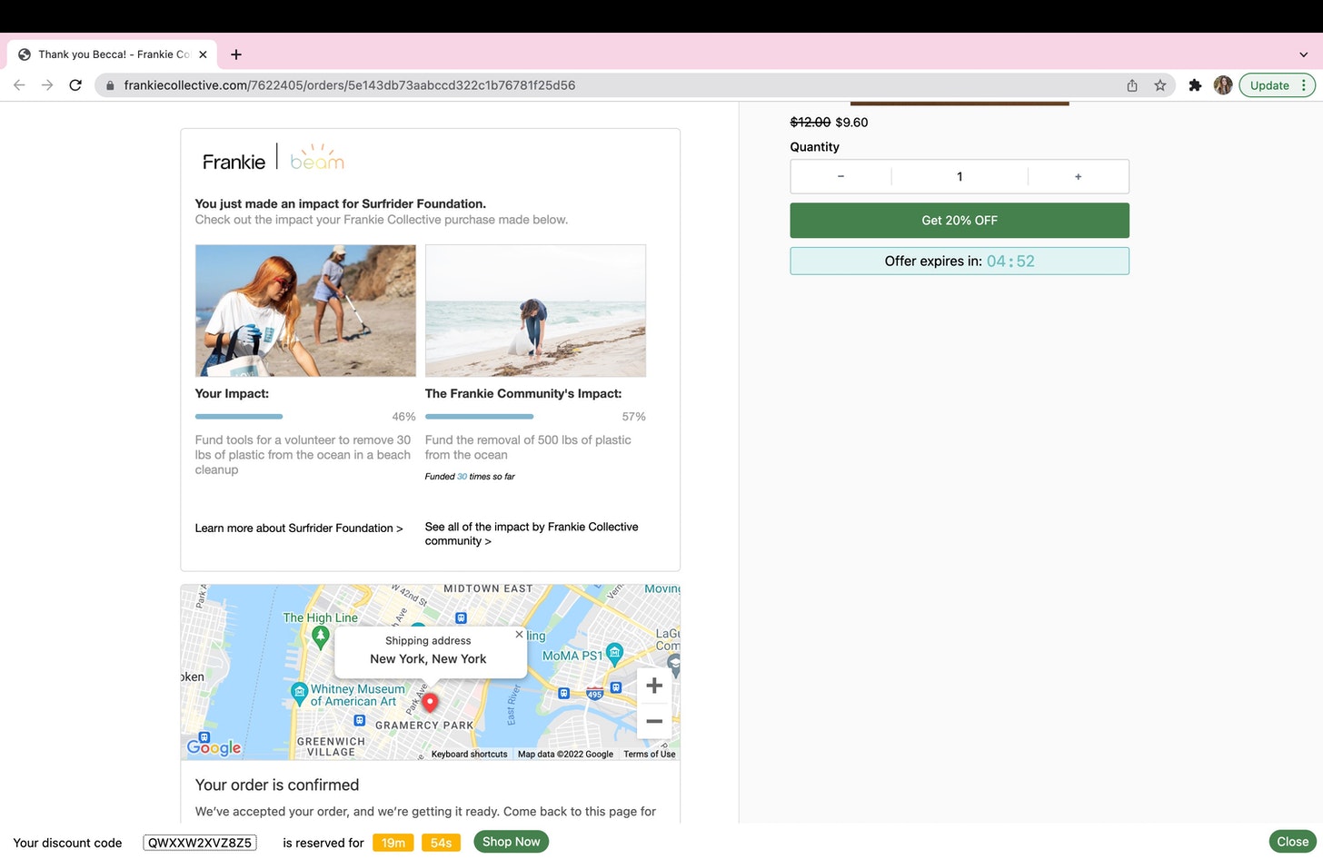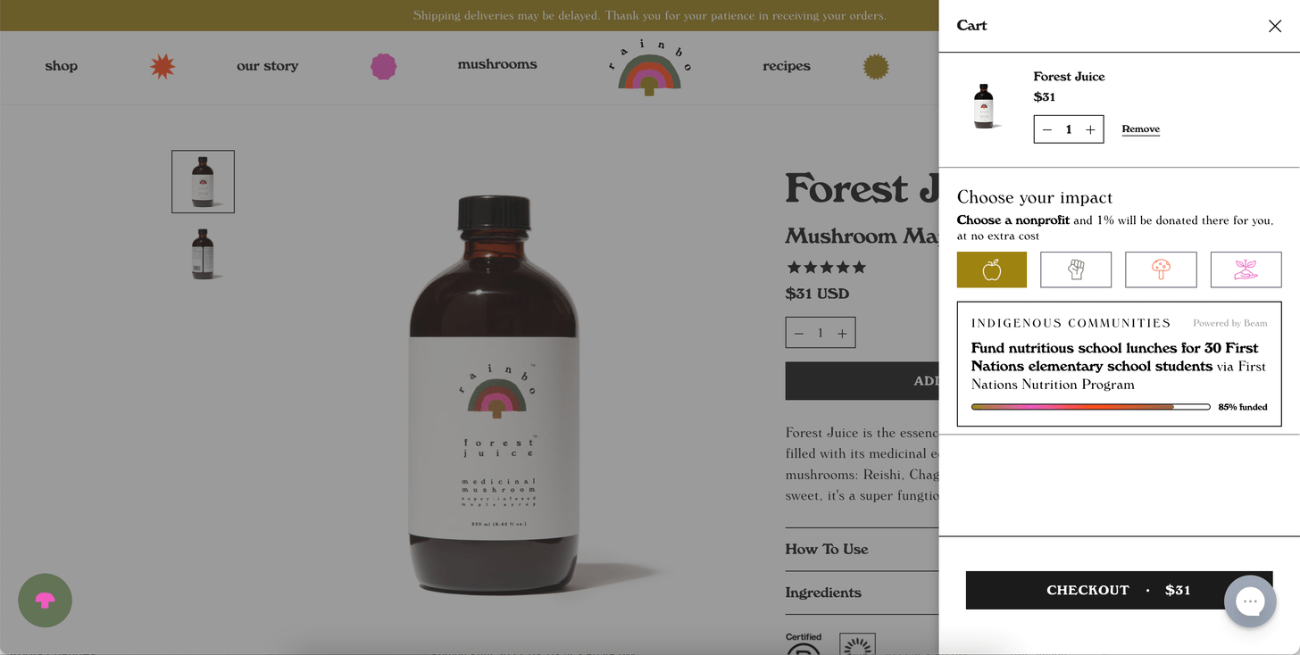 And importantly, Beam establishes a relationship between consumer and non-profit: a consumer ends their purchase journey with a reminder of how they contributed to an important, brand-aligned cause: