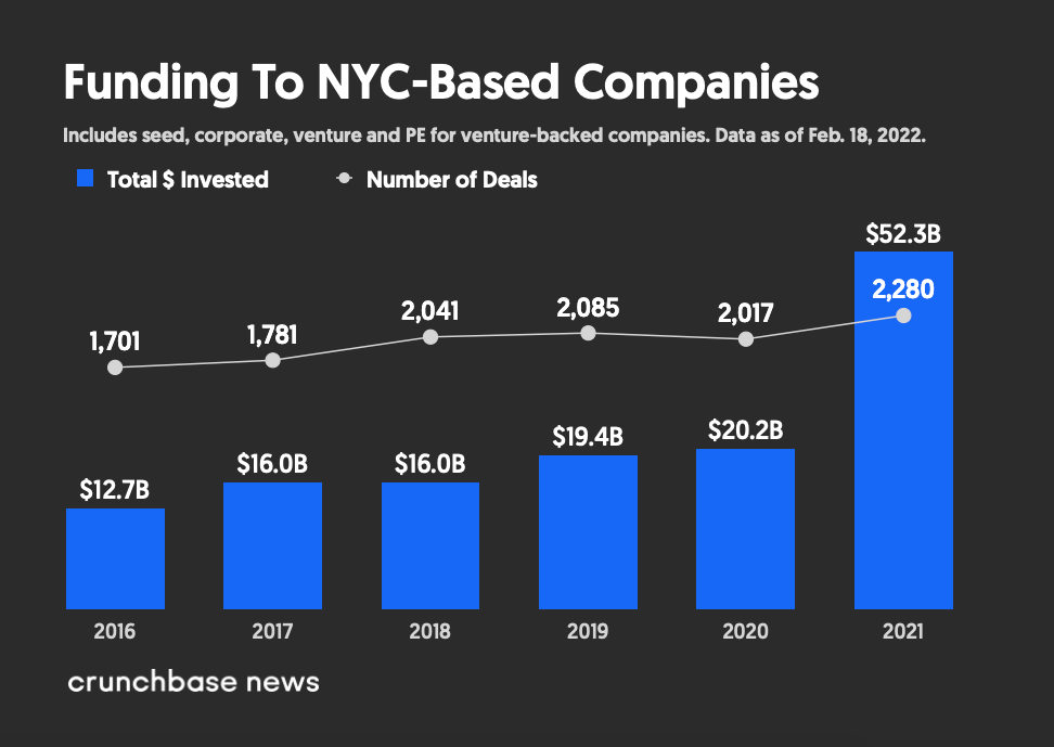 Of course, there are also a lot of business reasons to move back to New York. New York is exploding as a tech hub. Last year, NYC venture funding hit an all-time high of $52.3 billion—a 2.6x increase from 2020.
