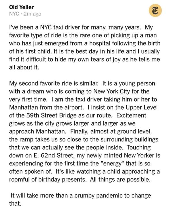 I often think back to a comment I read last year on a New York Times piece about how the pandemic was impacting New York. The comment was from a taxi driver, and it embodied New York’s spirit: