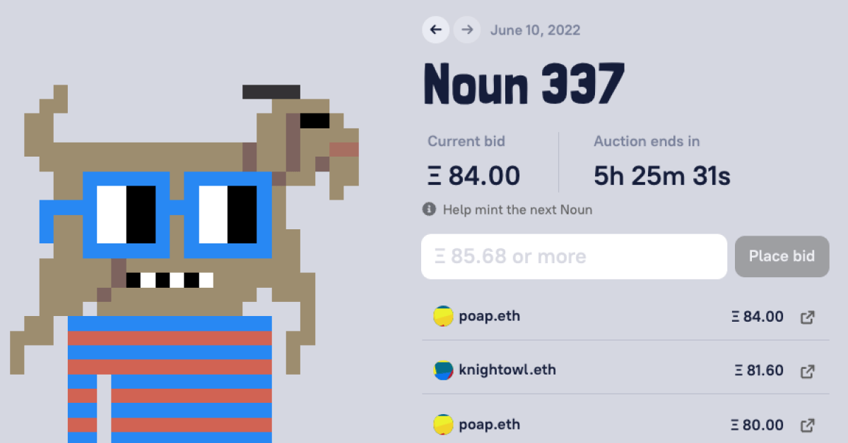 Most NFT projects launch with a limited number of NFTs (e.g., 10,000). Nouns DAO is different – every 24 hours, a new Noun NFT is auctioned to the public: