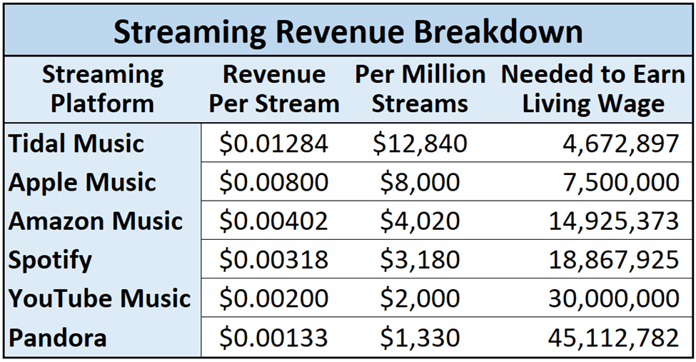 Artists and songwriters capture very little of the pie. To earn a living wage in the U.S., artists need to generate about 20 million streams every year. My friend Nick DeWilde recently shared a good table to visualize this: