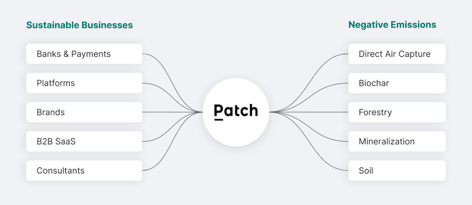 Another company powering sustainable commerce is Patch. Patch is an API-first marketplace for carbon removal. Put more simply, Patch lets businesses buy carbon offsets so that they can get carbon neutral or carbon negative. To summarize the two sides of the marketplace: