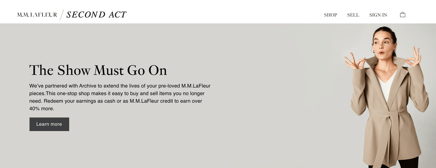 Archive, for example, is a white-label peer-to-peer marketplace that lets brands own the resale experience. Archive launched with MM LaFleur as its first customer—you can see here Archive’s white-labeled site on MM’s website: