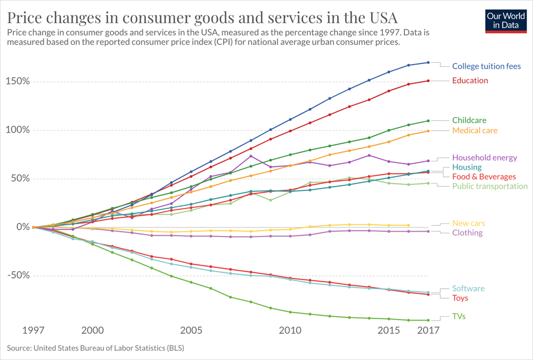 If you bought a flatscreen TV in 2000, it would’ve cost you $5,000. If you go to Best Buy today to buy that same TV, you can get it for $75. That’s a 98.5% drop in price. Yet a college graduate in 2000 paid $50K for her four-year degree at a public university; today, she has to shell out $100K (and $170K+ if she’s out-of-state).
