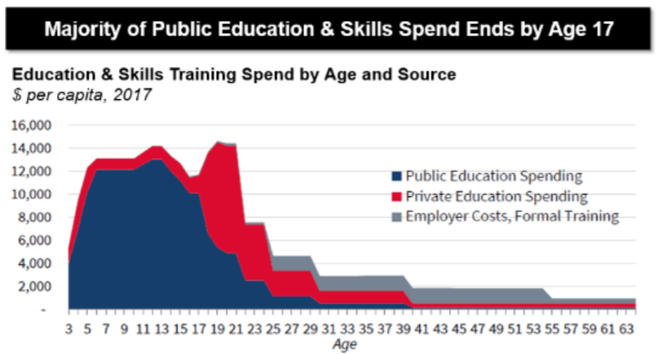 Today’s world requires more lifelong learning: the average worker might reinvent herself 3, 4, 5 times. Early years of education might focus on more horizontal, foundational skills—learning how to learn. Later years might be more job-specific, keeping up with the labor market’s pace of change. Many careers haven’t been invented yet: 85% of today’s college students will have jobs in 11 years that don’t currently exist.