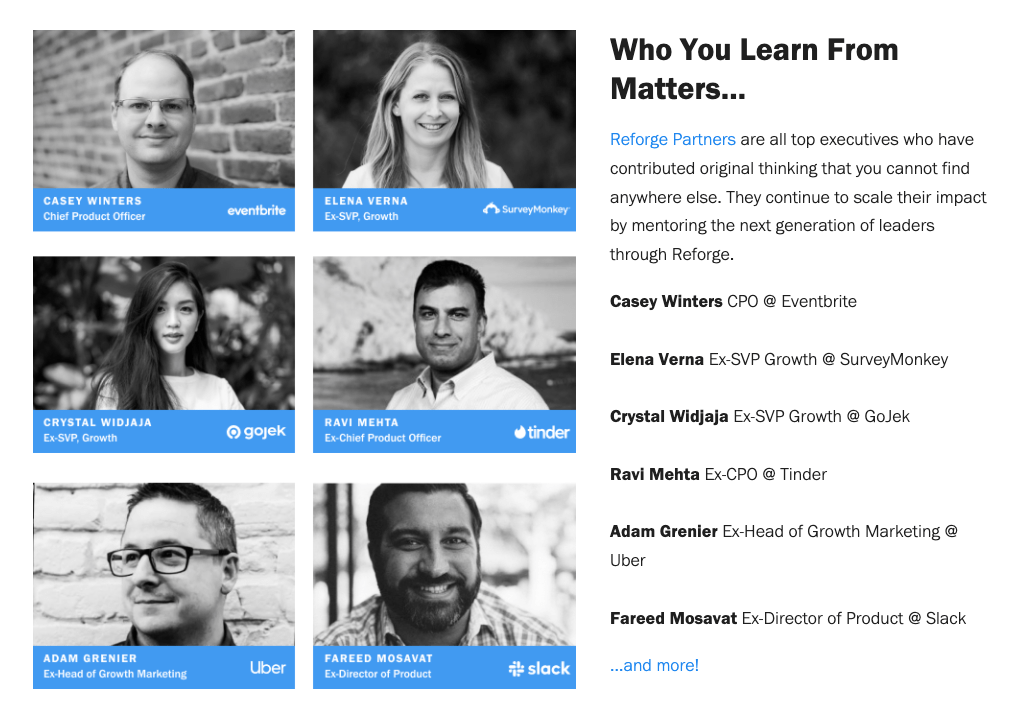 One of the most interesting companies is Reforge. Reforge is reinventing skills-based, job-relevant learning with a scalable and community-centric format. With Reforge, you can take courses like: Data for Product Managers, Growth Marketing, and Monetization + Strategy. Each course is taught by experienced leaders from the field:
