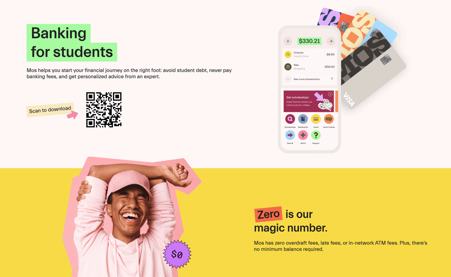 Mos offers banking for students, helping young people start their financial lives on the right foot—reducing student debt, avoiding banking fees, and getting personalized advice from a financial advisor. For instance, Mos has helped 400K+ students save a collective $1.5 billion on college tuition by connecting students with scholarships and hard-to-find government aid.