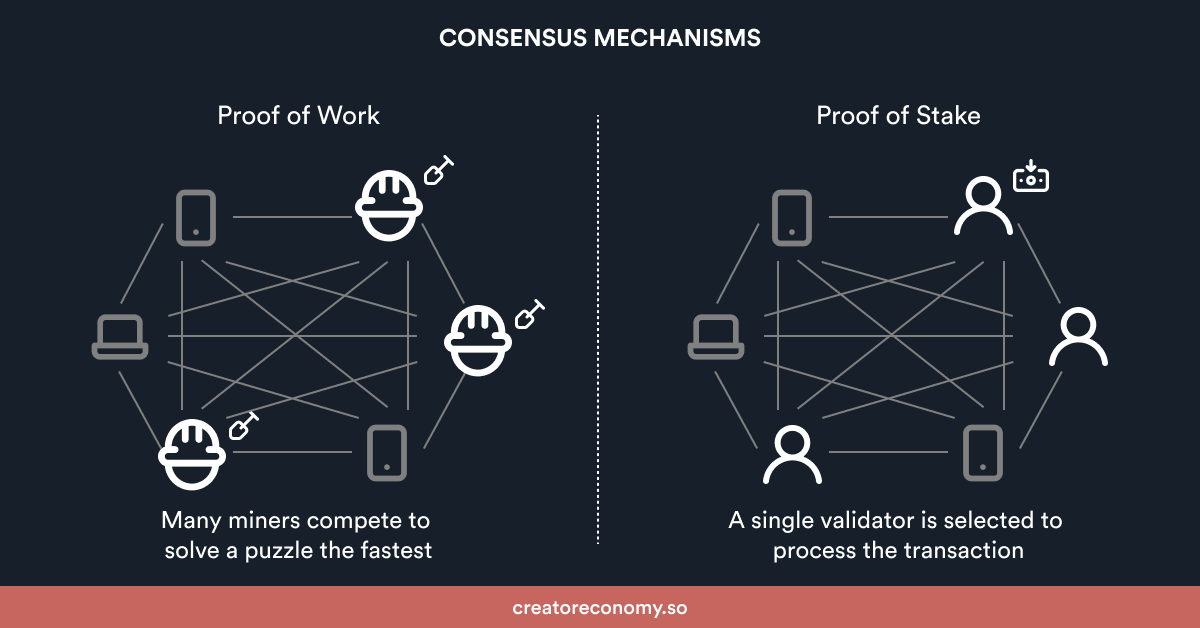 To process transactions without trusting middlemen, nodes need to be able to reach consensus themselves. They do this through two popular methods: