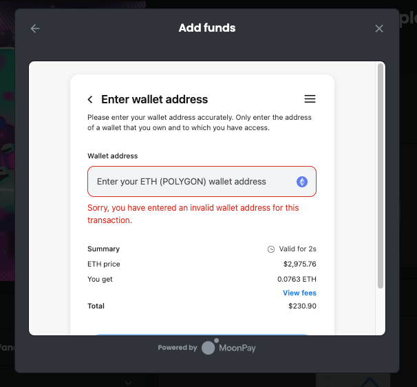 Fiat to Polygon: You can buy Polygon ETH and MATIC with your credit card using platforms and exchanges like Moonpay, Sendwyre, and crypto.com. If you want to buy a Polygon NFT for example, you can tap “Buy with card” directly from an OpenSea Polygon NFT listing using Moonpay. Note that you need to verify your personal information (e.g., upload a driver’s license) to use fiat to buy Polygon.