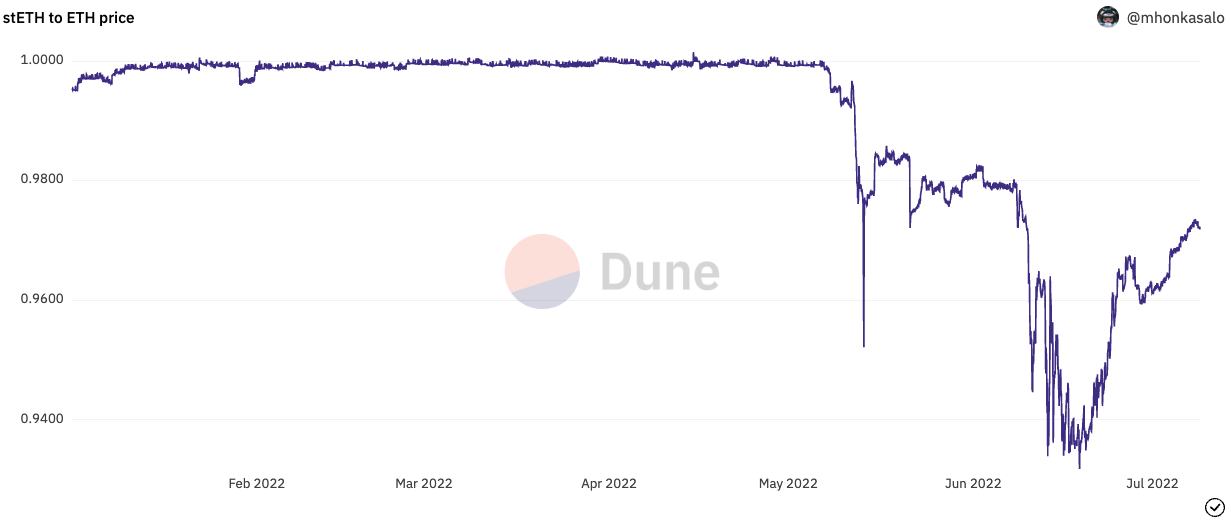 The bear market arrived and stETH investors became antsy. Many of them started swapping their stETH for ETH, including 3AC and Celsius. Eventually, the liquidity pool didn’t have any ETH left, so swaps were no longer possible.