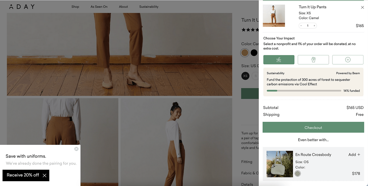 Like BNPL, Beam lives in the checkout flow. You’ll see it as you go to pay. At checkout, you’re given the option to contribute a certain percentage of your cart size—typically 1%—to a non-profit. Here’s what it looks like when you shop on the clothing store Aday: