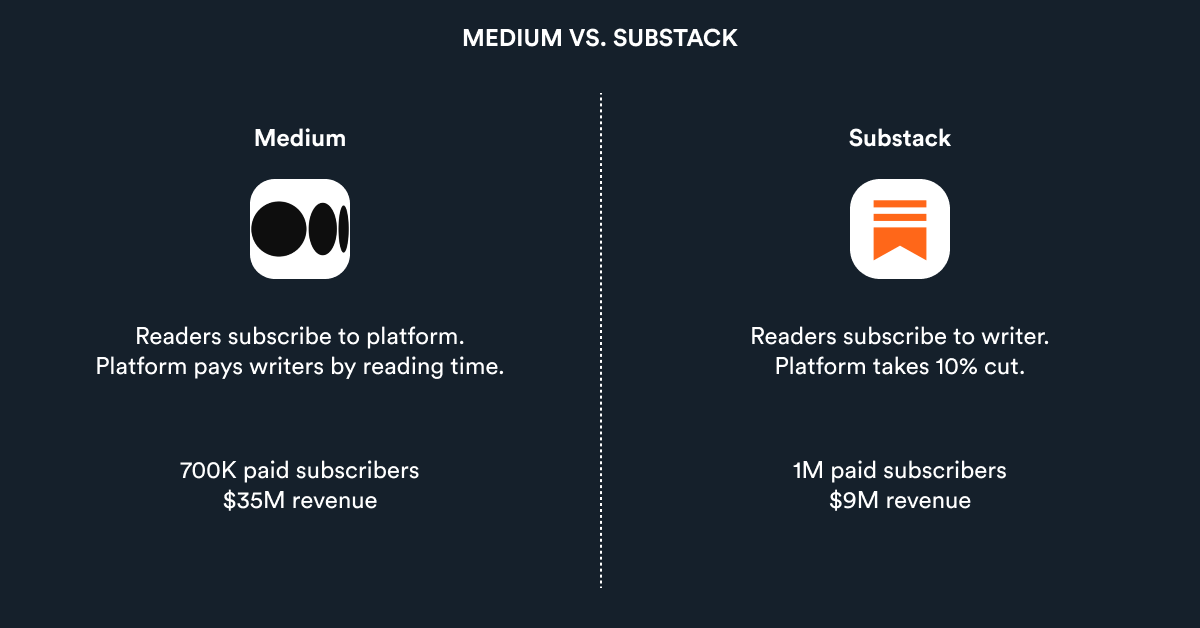 Medium had 700K paid subscribers and made ~$35M in 2021. However, as Nathan wrote, this model doesn’t attract the best writers who would rather own their audience and brand.