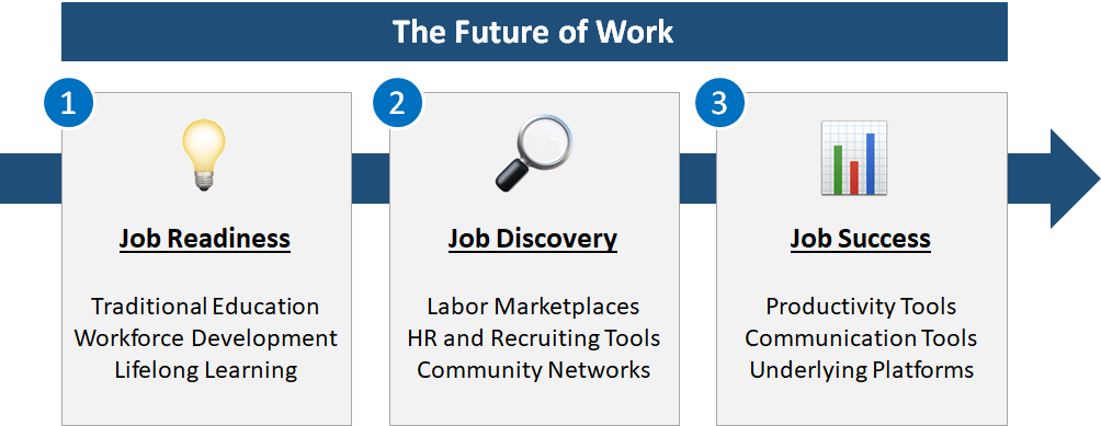 But “the future of work” is broader than the term’s original characterization: the future of work also encompasses how workers prepare for work, find work, and carry out that work.