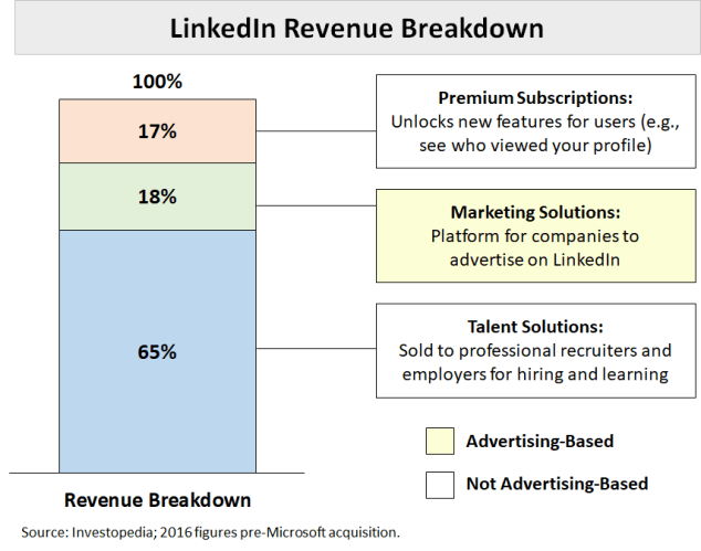 While most social networks monetize almost entirely through ads (Facebook and Snap both have 99% of their revenue coming from ads), LinkedIn has a more diversified model. LinkedIn makes money in three main ways: