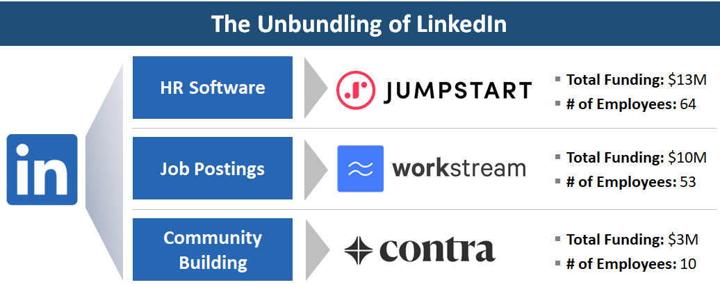 One key thesis I’ve written about in the past is the unbundling of LinkedIn. We’re seeing this both with broad upstarts like Polywork (which you can think of as LinkedIn for Gen Zs, or LinkedIn for more project-based work), and startups building in each of LinkedIn’s key monetization buckets: