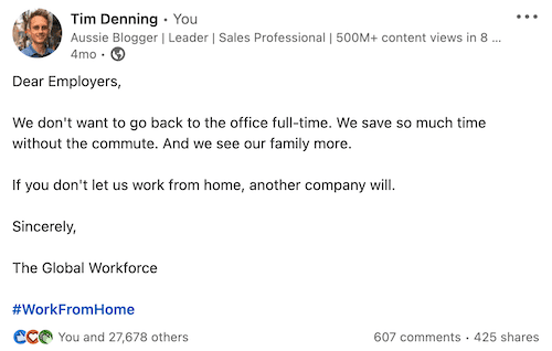 This post went viral. It looks like the global workforce wants work from home forever. Nice. Enjoy your freedom peeps.