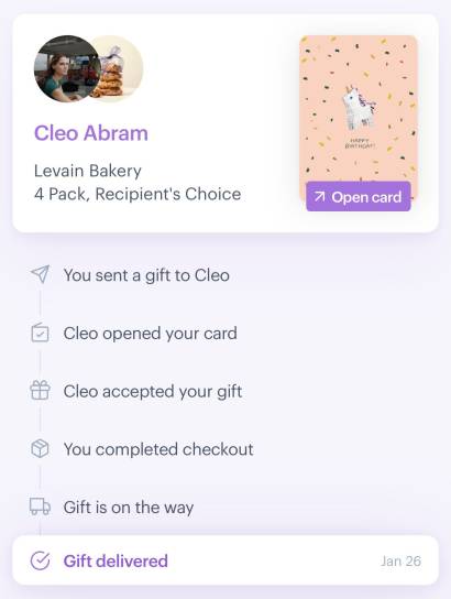 For instance, here’s a screenshot from sending my friend Cleo (a fellow tech optimist—check out her YouTube channel) Levain cookies for her birthday. The transaction all happens over text—the most intimate social channel we have.