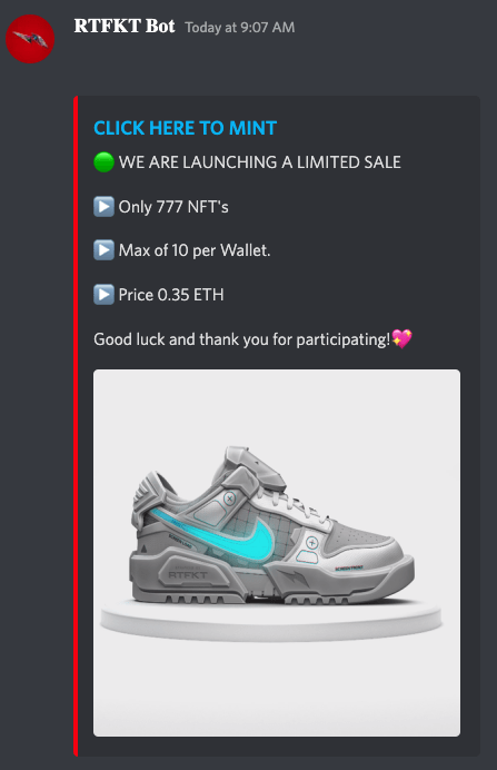Nike acquired RTFKT (pronounced “Artifact”) in December 2021 to bring on talent that already had a proven track record for digital sneaker and NFT drops.