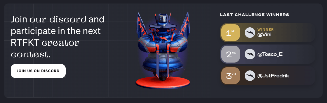 RTFKT’s Discord server has 245K members. The team runs regular creator challenges where members are invited to design and sell NFTs (at 50% artist / RTFKT split).