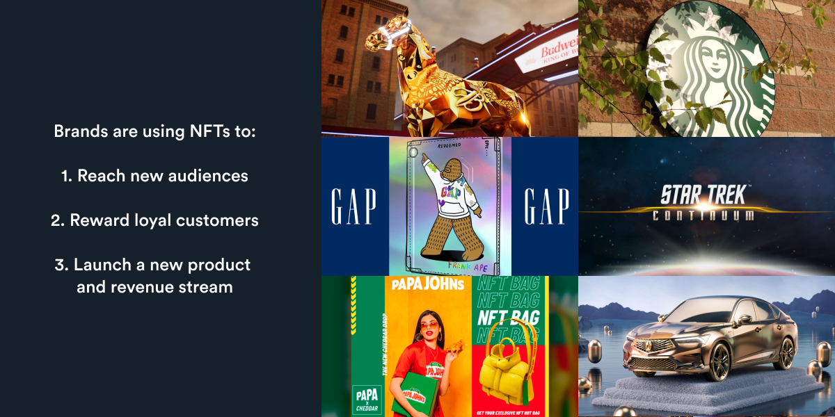 Brands, like creators, want to skip the middleman to build a direct relationship with customers. Brands are using NFTs to: