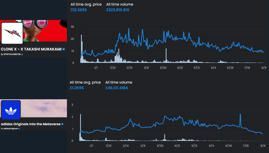 Both Nike (RTFKT) and Adidas are committed to their NFT projects. RTFKT in particular is building an entire ecosystem around Clone X (virtual sneakers, hoodies, spaces, etc). This is reflected in the relative volume and price of both collections: