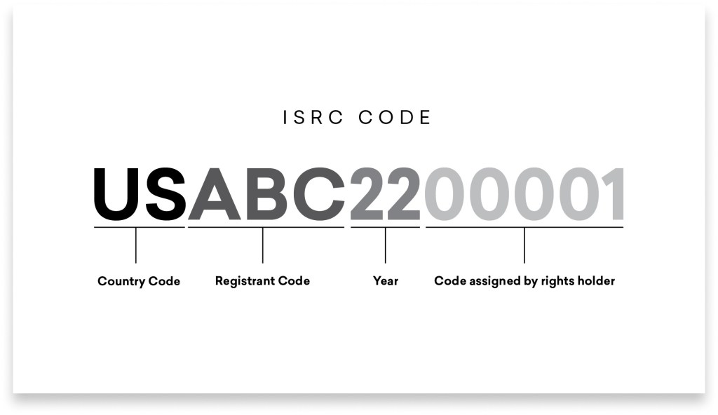 The first two letters indicate the country of the recording’s origin, followed by three letters for the registrant’s code, two numbers for the year of recording and finally five numbers for the song’s right’s holder code.