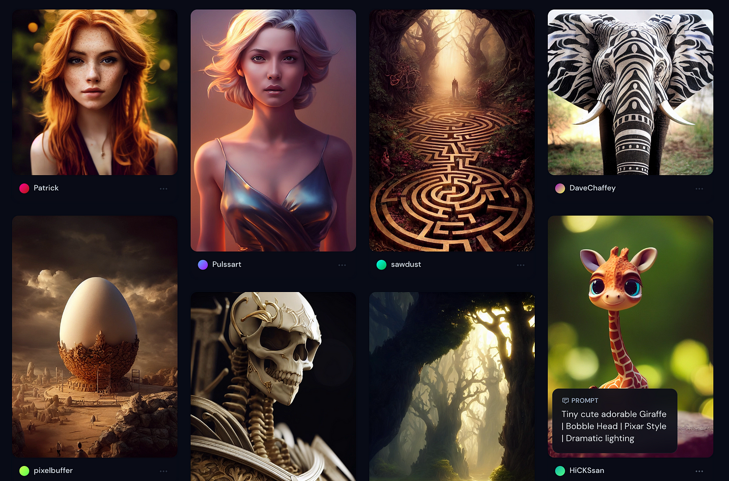 If you hover over an image in the showcase, you see the text prompt that led to that image. For instance, the prompt in the bottom right image here is “Tiny cute adorable Giraffe | Bobble Head | Pixar Style | Dramatic lighting”—