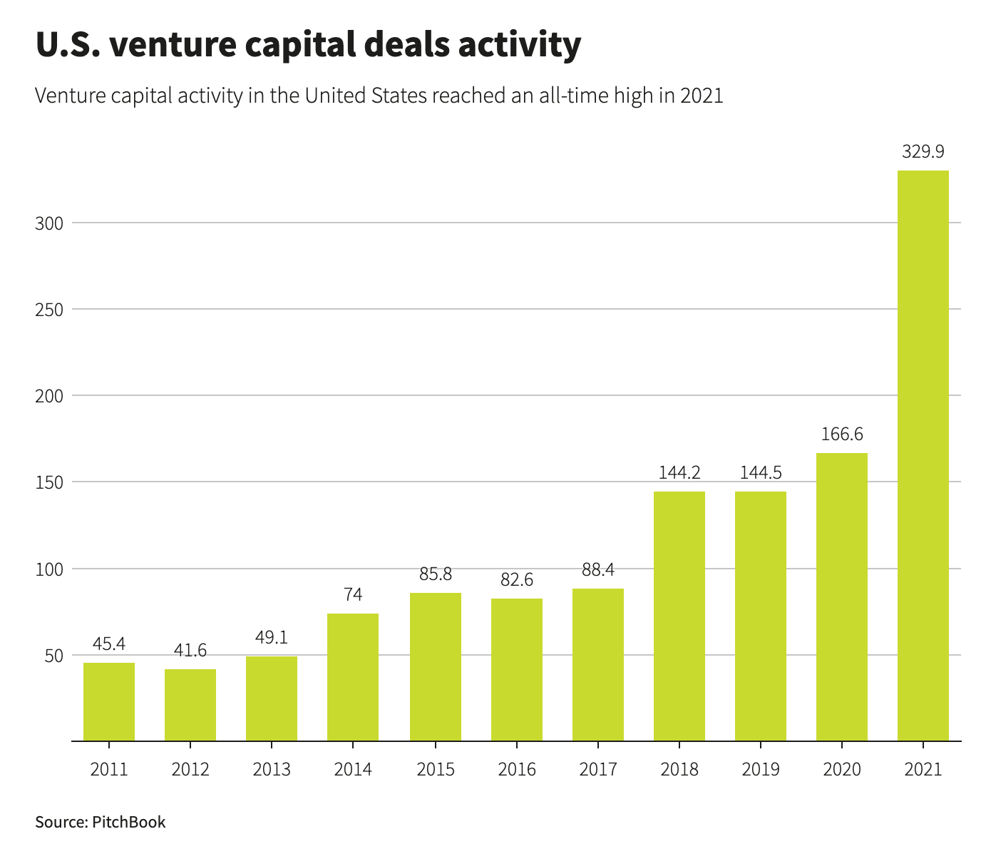 Each is interesting for distinct reasons and within distinct use cases—but each is also very, very early. The entire VR industry is equivalent to just 2% of Apple’s 2021 revenue. Much of the hype surrounding new technologies and vaunted “platform shifts” derives from anxiety around mobile and cloud being…old. AWS launched in 2006; the iPhone came out in 2007. Neither mobile nor cloud are saturated, but they aren’t as ripe for greenfield opportunity as they once were. At the same time, we’ve seen an unprecedented influx of private capital chasing startups: