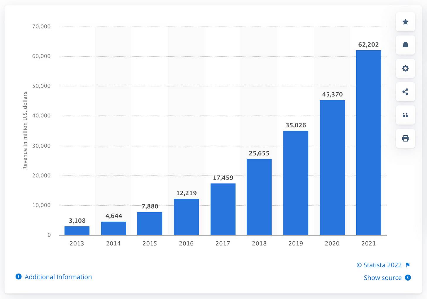 Few charts are more impressive than that of Amazon Web Services revenue over the past decade (with 35% profit margins to boot!):