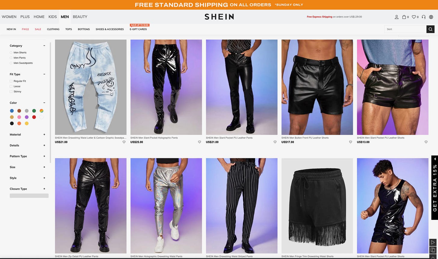 Over the weekend, I went online shopping for a friend’s upcoming 30th birthday party. The party is Euphoria-themed, meaning you basically come dressed like Maddie or Cassie or Nate Jacobs from the HBO show. I’ve never shopped on SHEIN before, but I typed in “men’s mesh black top” to look for a shirt. Then I clicked on the “Pants” category and was met with this screen: