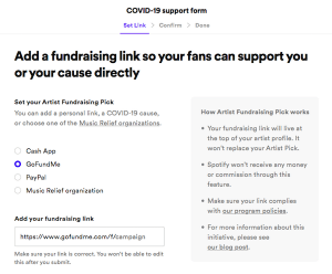 Simply log in, click on the blue banner in the Spotify for Artists Dashboard (“You can now add a fundraising link to your profile so your fans can support you or your cause directly”) and fill out the form: