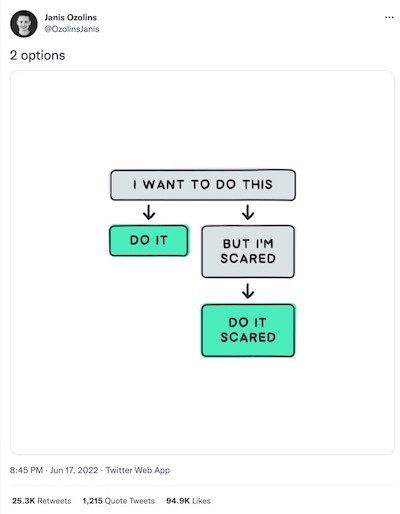 The trick isn’t to escape the feeling and put your safety pants with brown stains on the rear back on. The answer is to do it scared. “Feel the fear and do it anyway” as Tony Robbins says.