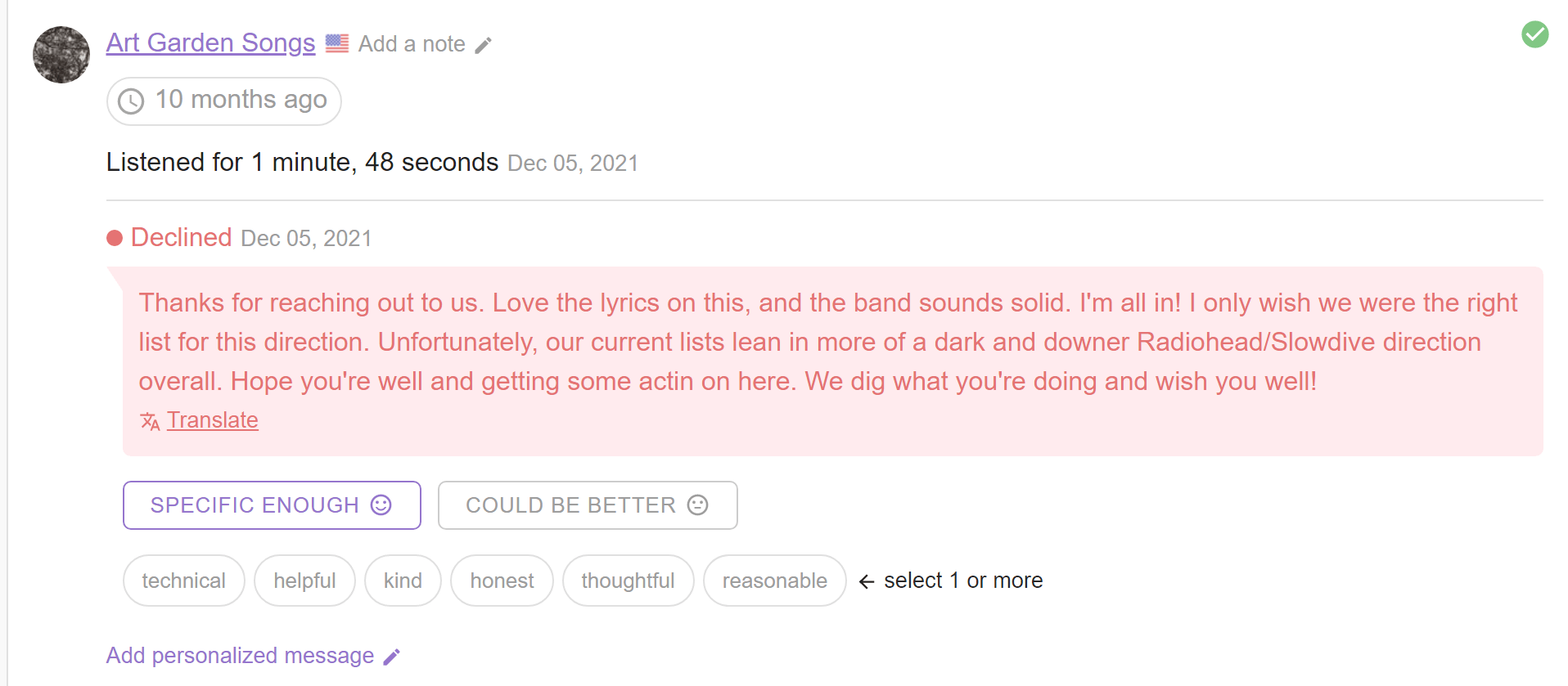 Here’s the thing: Just because you’ve paid for your music to get covered, it doesn’t mean that you’ll get featured. But, receiving feedback is an essential way to build on your campaigns—and can be a great stepping stone in improving as an artist overall.